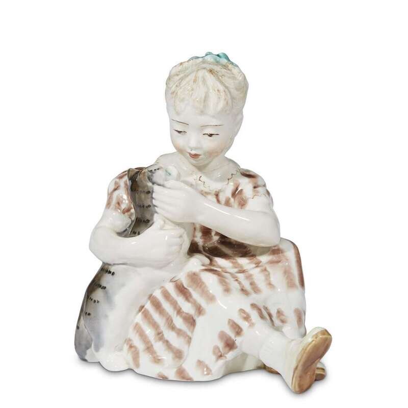 A Soviet faience group "Little Girl With A Kitten" Konakovo Faience Factory, Tver, after 1955