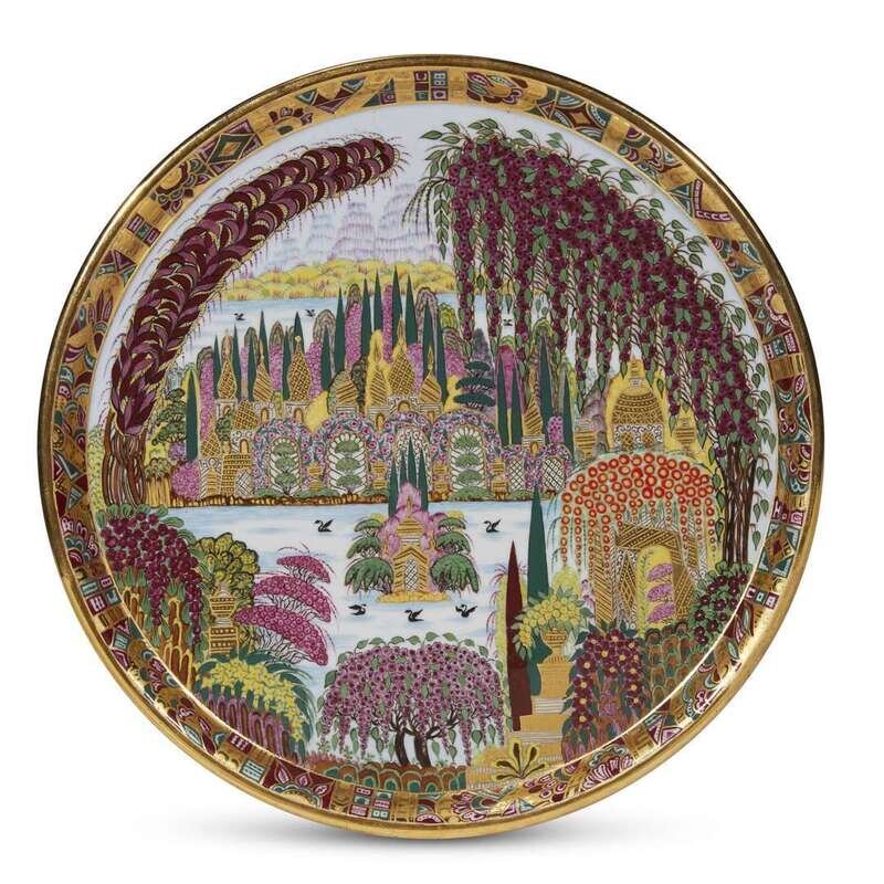 A porcelain plate by Aleksei Viktorovich Vorobevskii (1906-1992), designed 1967, inscribed on back in Russian "Author of decoration Nat[ional] Art[ist} Vorobievskii. type "The Arrival of Spring." and with iron red factory mark.