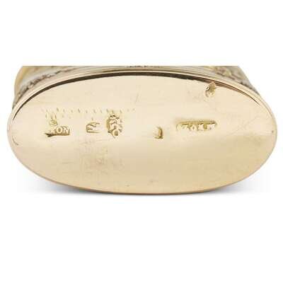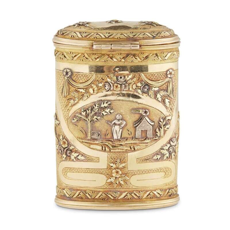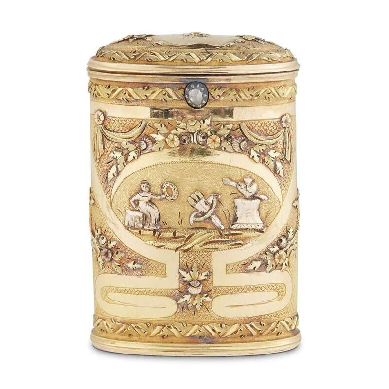 Maker's marks indistinct, struck inside lid and on base, the whole decorated with strapwork and garlands en deux couleurs, each side centering cartouches with allegorical scenes, the thumbpiece set with a rose-cut diamond.