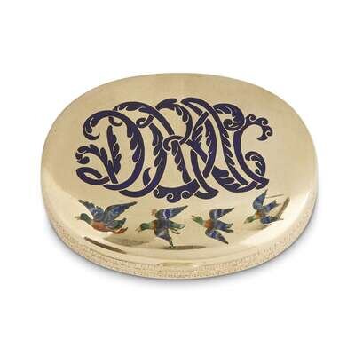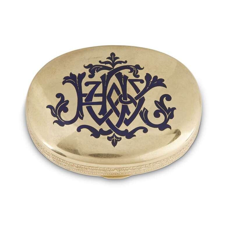 Oval, one side with enamel birds and florentine script monogram 'NAG' (?) the verso with gothic strapwork monogram 'HWK' in cobalt blue.
