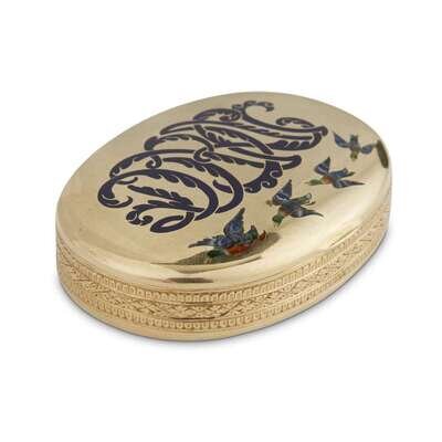 A champlevé enameled 18-karat gold oval pillbox likely Swiss, apparently unmarked, circa 1880