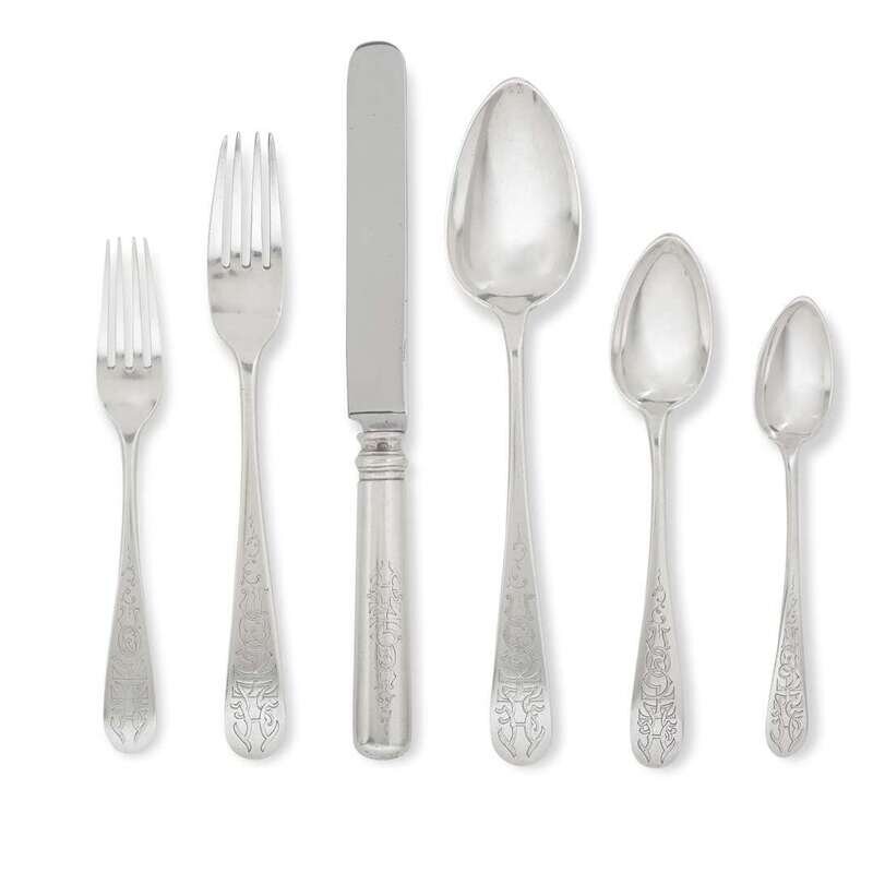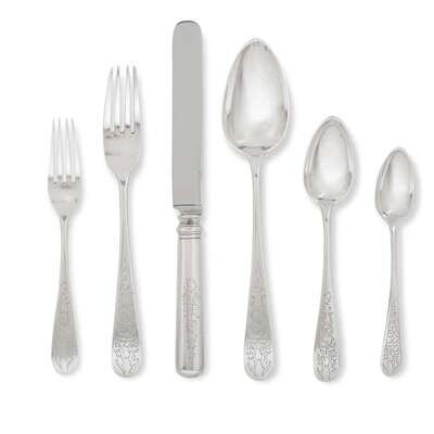 Comprising twelve each dinner forks, luncheon forks, dinner knives, place spoons, and teaspoons; nine tablespoons; four master salts; three serving spoons with knots; two platter spoons (one with knot); and one each sauce ladle, pierced ladle, cheese server, sugar shovel, and flat server; 41 pieces signed Sazikov with Imperial Warrant, 42 with maker's marks for Gustav Alexander Sohlman, 1 spoon unmarked, each piece engraved with the full name "Hutton;" sold in associated fitted box. (83).