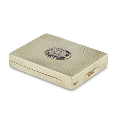 Rectangular, with engine-turned reeded exterior, the hinged lid set with an oval mount enameled G with leaves in cobalt, opening to reveal a mirror, powder case, and lipstick slide, marked 14k to interior, and '...6 722' to interior of lipstick case.