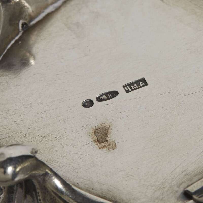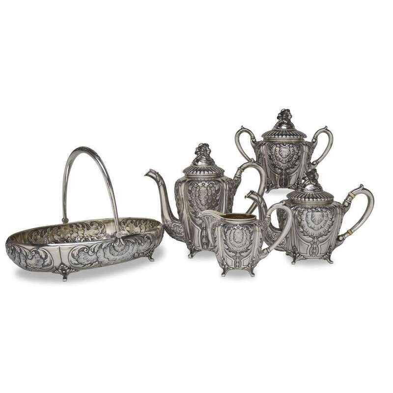 In the Rococo Revival taste and comprising a swing-handled cake basket and coffeepot with marks of Baranov, and a teapot, hinged covered sugar bowl and creamer by the 4th Artel, the bodies with chased scrolling foliate ornament separated by shaped panels, the interiors gilt-washed. (5).
