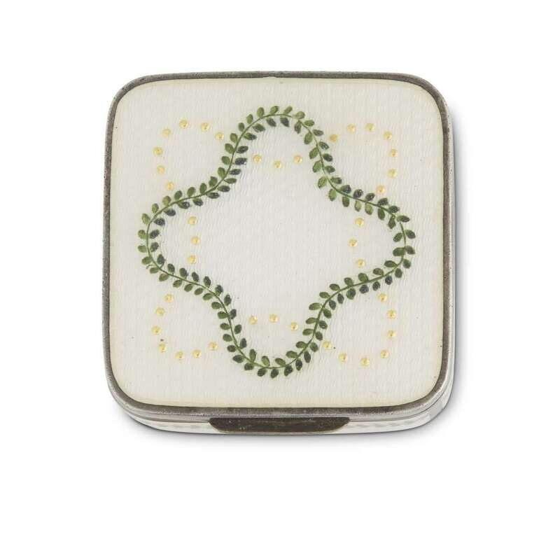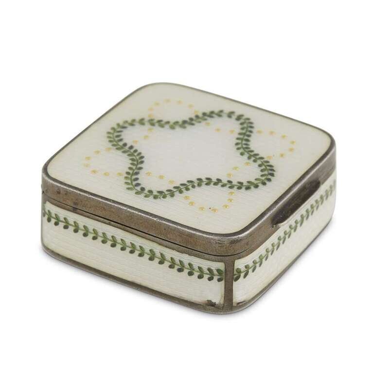 The rounded rectangular pillbox with green laurel quatrefoil enamel over gold leaf points above an ivory guilloché ground, the banded sides similarly decorated; struck inside lid with maker's mark "G.A.S." (Georg Adam Scheid) the hexagonal lozenge mark with Diana head and a "2" and an "A" (Austrian silver mark for 900/1000 purity silver plus assay for Vienna after 1872).