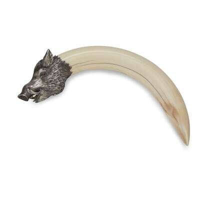 Naturalistically modeled and cast in the form of a boar with cabochon gem-set eyes, the snout mounted with a sprung cutting mechanism with release button below jaw, apparently unmarked.