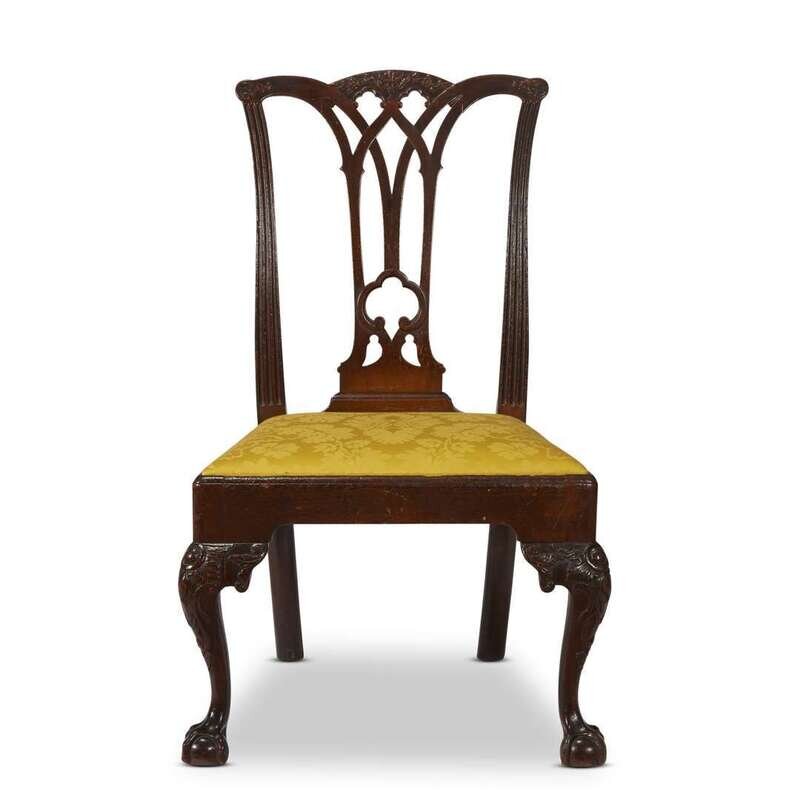 With pierced Gothic splat, fluted stiles, and acanthus and floral carving to crest and knees, on ball-and-claw feet.