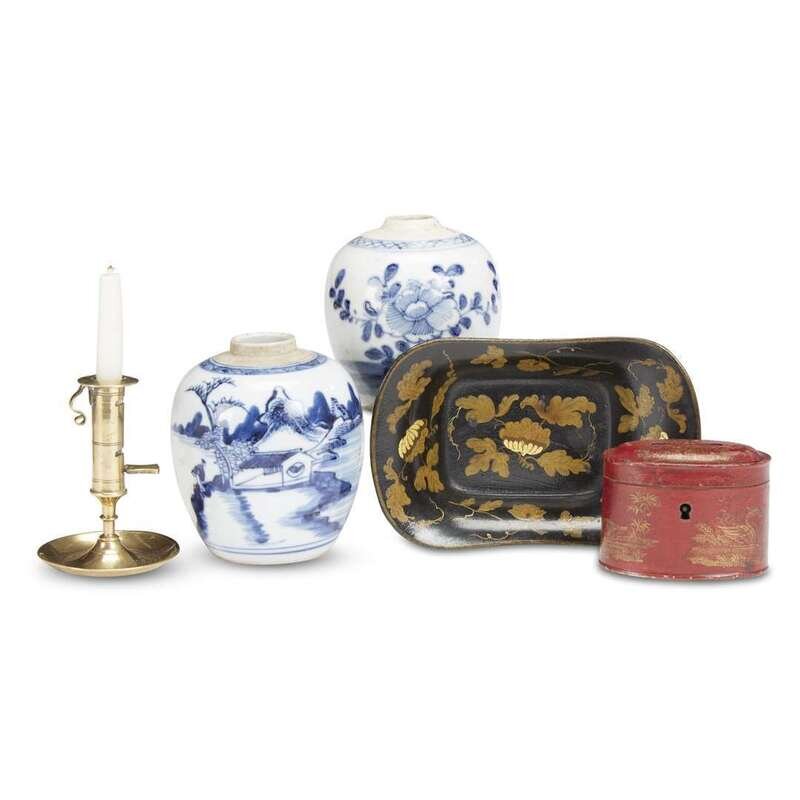 Including a miniature brass chamber stick, Japanned tray, Chinoiserie painted tin bank box and two blue and white ginger jars.