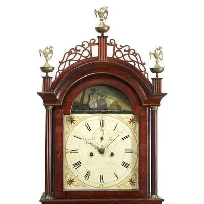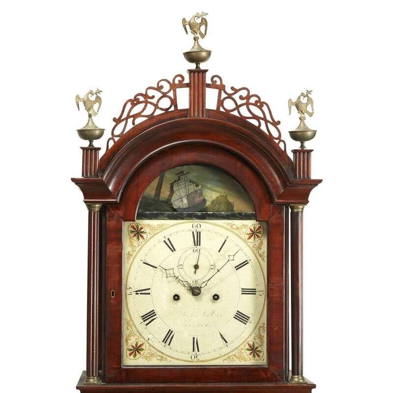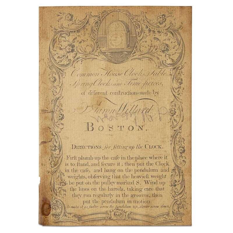 Face inscribed, "Aaron Willard, Boston," waist door retains engraved label (Paul Revere), original spreadwing eagle brass finials and red Japanned weights.