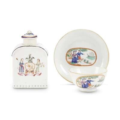 Chinese Export porcelain 'Arms of New York' tea caddy and 'Sailor's Farewell and Return' teabowl and saucer early 19th century