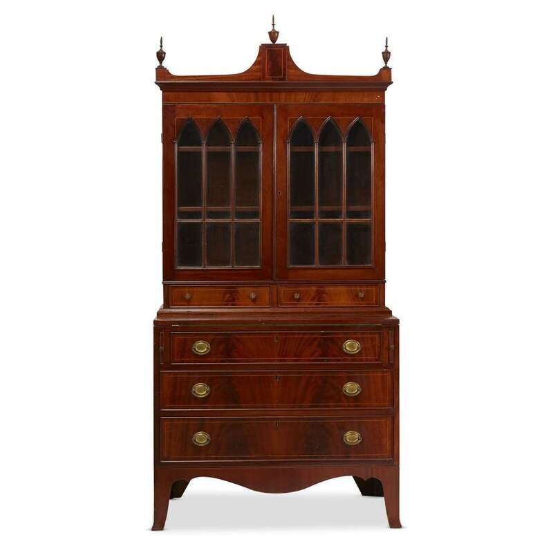 The stepped cornice with urn-form finials, above two glazed doors with Gothic tracery enclosing shelves, and lower case with three drawers.