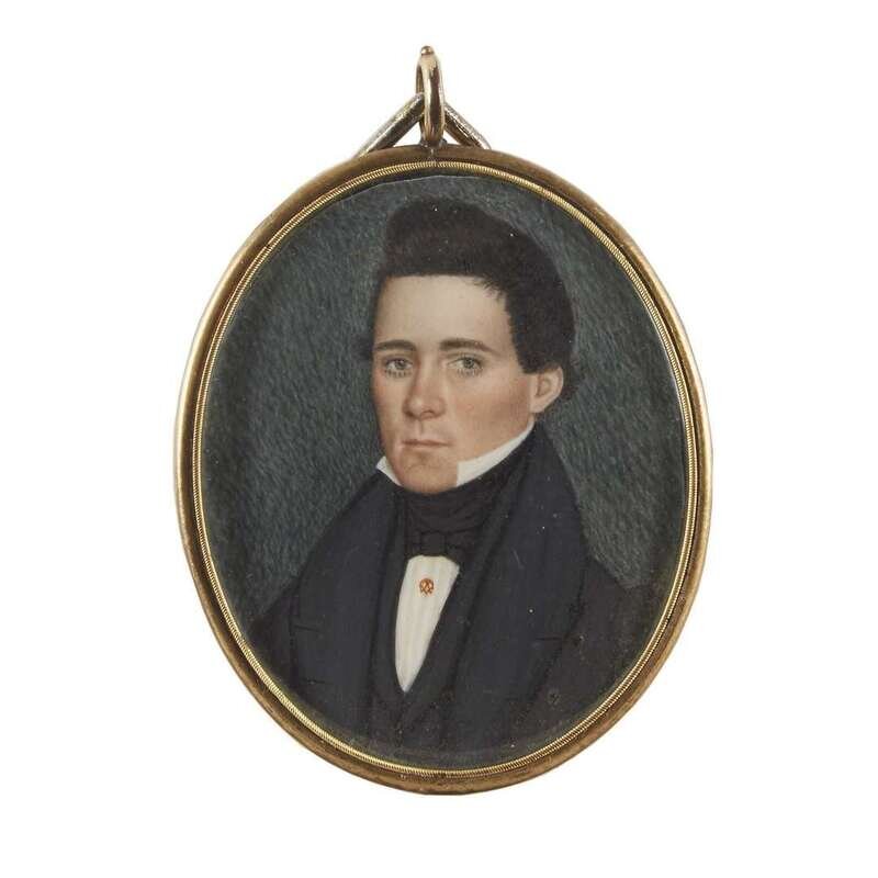 Mrs. Moses B. Russell (aka Clarissa Peters, 1809-1854) Portrait miniature of a young man wearing Masonic pin