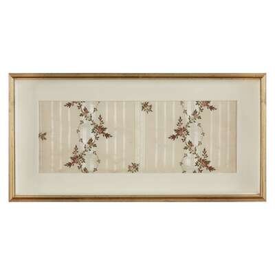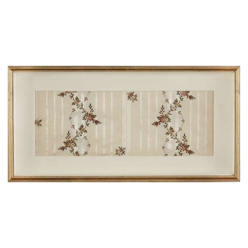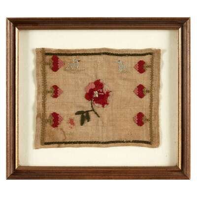 Framed floral silk brocade dress fragment and needlework sampler of Dolly Madison, Washington and Clemson Family interest Southern States, early 19th century