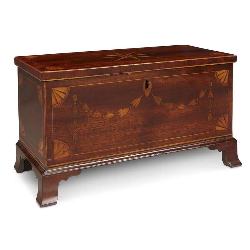 The top inlaid with mariner's compass and quarter fans, the front inlaid with drapery swags, quarter fans and penned flowers inside roundels.