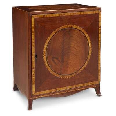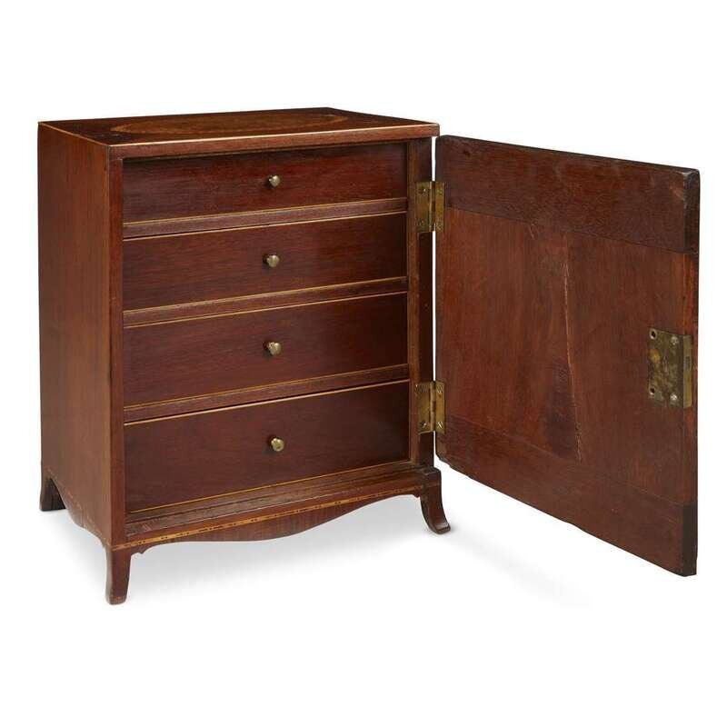 y, VA, circa 1800 Front and top inlaid with round and oval panels, the door opens to four drawers.