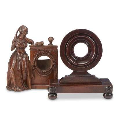 Together with watch hutch having a molded circular frame on a square base and bun feet.