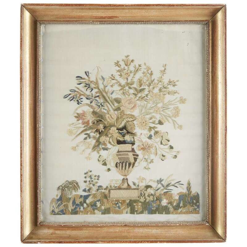 Flower-filled urn worked with chenille on a silk ground, framed.