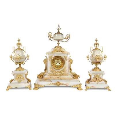 Fine three-piece marble and ormolu clock garniture Retailed by A.B. Griswold & Co., New Orleans, LA, late 19th century