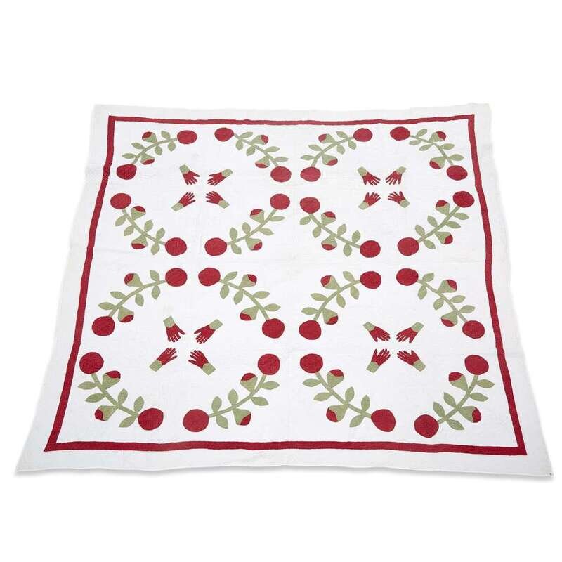 Printed and solid patches arranged in a pattern of four hands enclosed by rings of budding vine, heightened with diagonal line, conforming and flowerhead quilting.