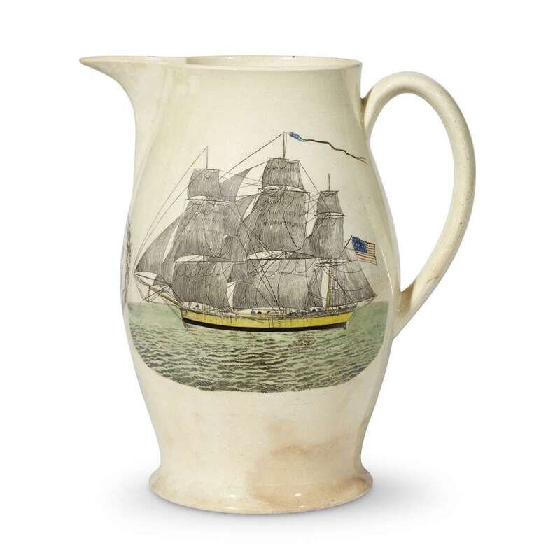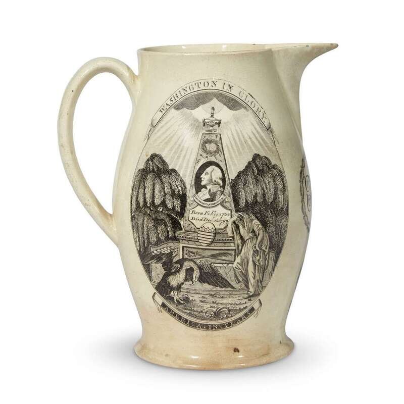 Transfer-printed and enameled creamware presentation jug England, circa 1800
