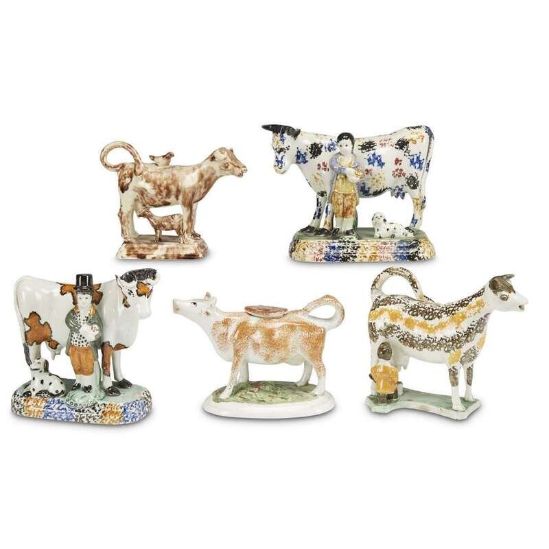 Assembled group of five pearlware and Prattware cow figures and creamers England, late 18th/early 19th century