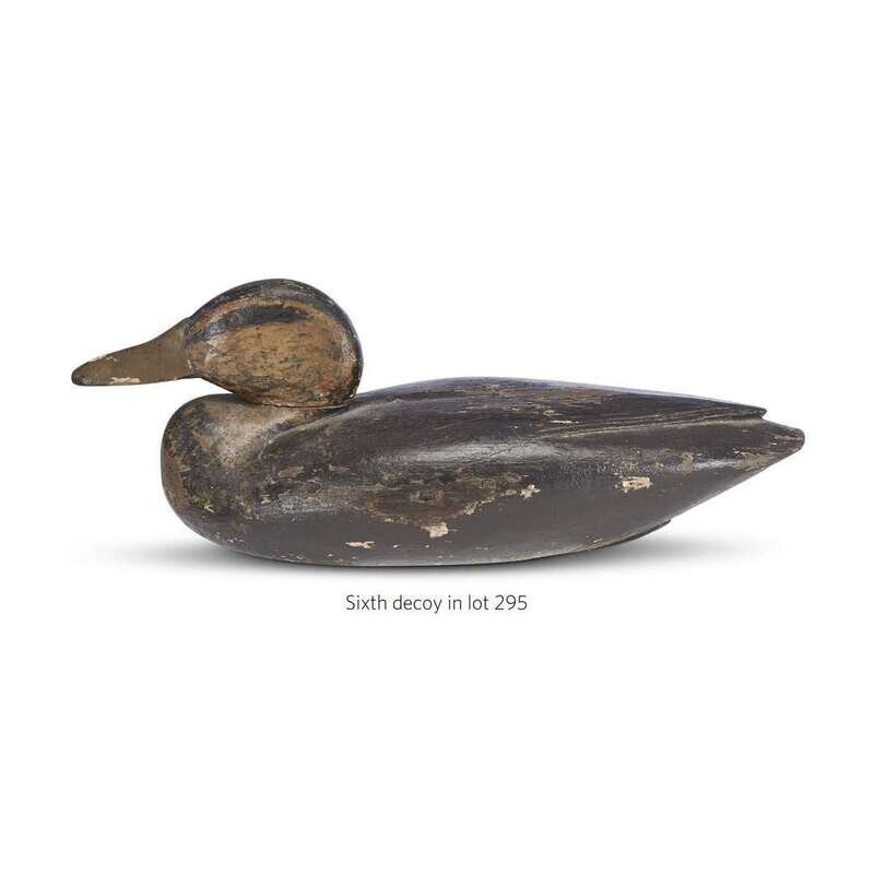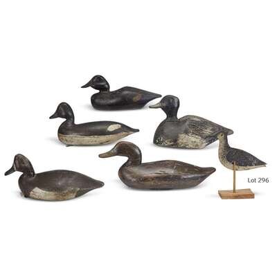 Including a Goldeneye attributed to Harry V. Shourds; a Black Duck, bearing stamp of the Mackey Collection; a Broadbill Hen by Frank Lewis; a boldly carved Blue Bill; and a Black Duck decoy.