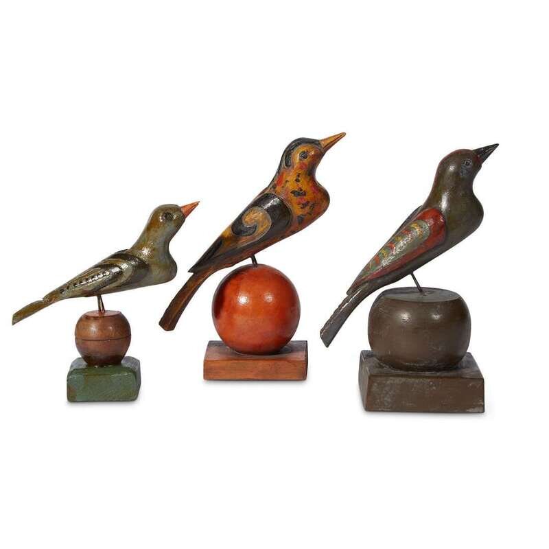 Three carved and painted birds on spherical stands in the manner of Schnockschnitzler Simmons (active 1895-1910) Robert Stauffer, late 20th century