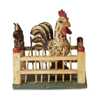 Carved and painted fenced garden with rooster and squirrel in the manner of Wilhelm Schimmel (1817-1890) Robert Stauffer, late 20th century