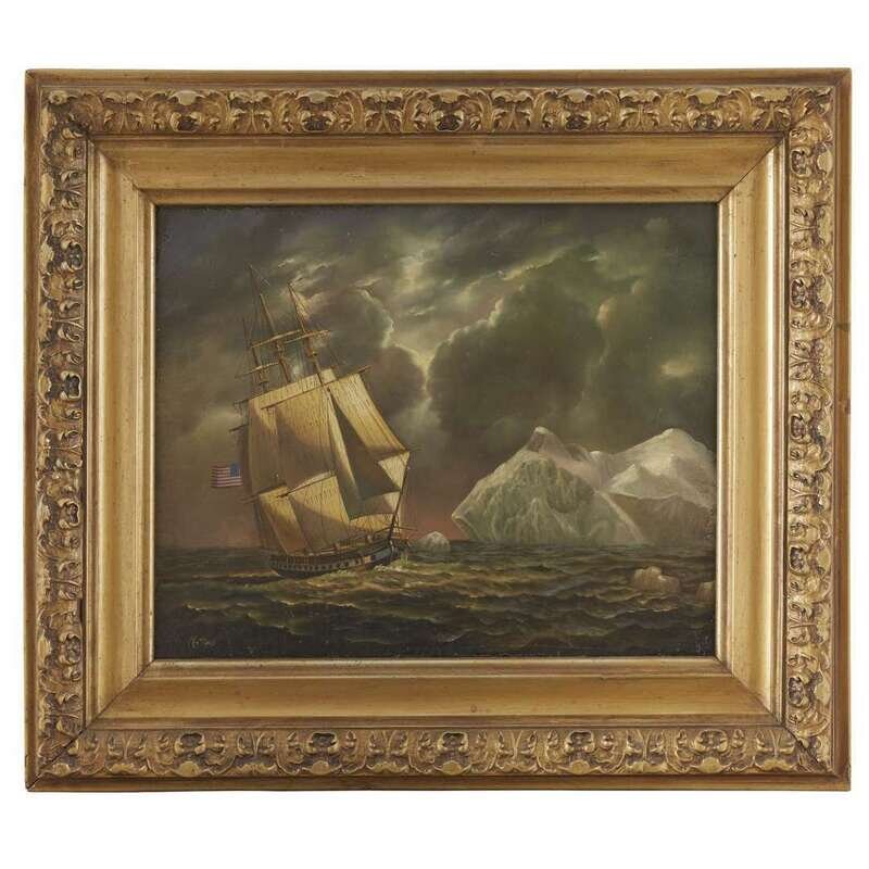 American School 19th century Ship Flying the American Flag in Rough Waters