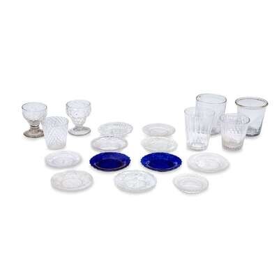 Including five tumblers, two open salts, and eleven cup-plates with patterns including American Eagle; three Henry Clay - two in dark blue; Beeskep; Log Cabin; Chancellor Livingston, Bunker Hill Monument; and Butterfly.