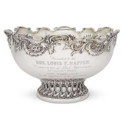17-pint bowl above a pierced acanthus form ring base, marked underside, the body engraved: "Presented to the/ Hon. Louis F. Haffen/ Commissioner of Street Improvements/ 23rd and 24th Wards/ New York City/ By the employees of his department/ December 31st, 1897."