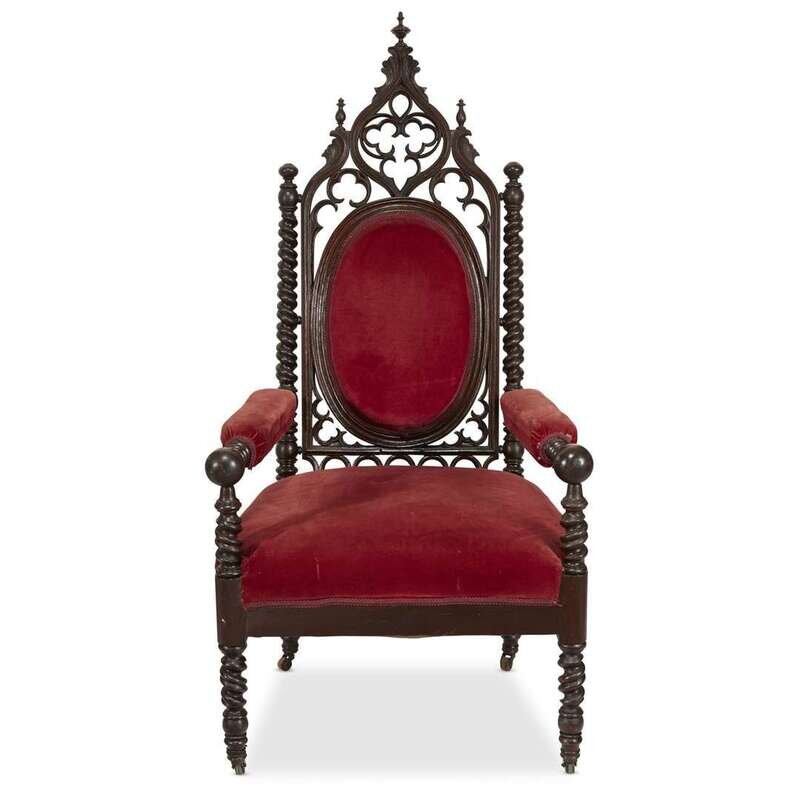 With elaborately carved Gothic crest and bobbin-turned arms, on casters.