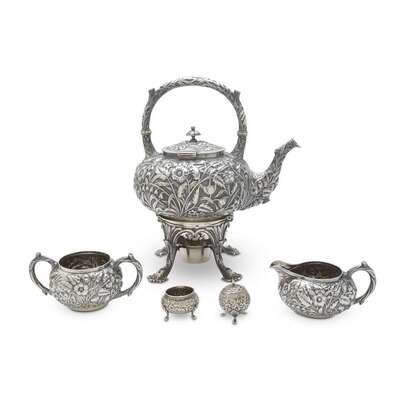 Comprising a kettle on stand, creamer, and sugar bowl, marked and engraved, "Kate MJ Mulligan" to undersides; together with a silver salt cellar and shaker, unmarked.