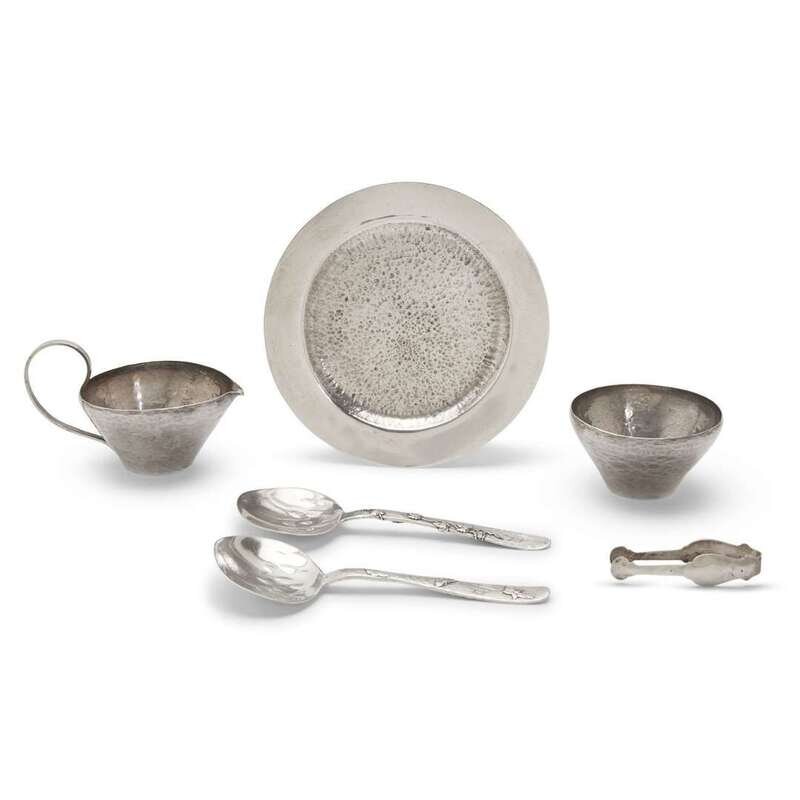 Each with hammered ground and cast and chased insects; together with a group of hammered sterling silver tea wares: sugar bowl, creamer, and sugar tongs, by William Waldo Dodge, Jr. (Ashville, NC, active 1924-1942), marked to undersides, and small round hammered tray, unidentified mark.