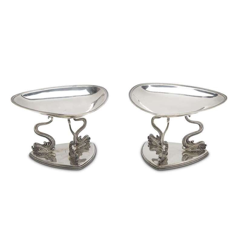 Pair of sterling silver tazze with dolphin form feet 20th century