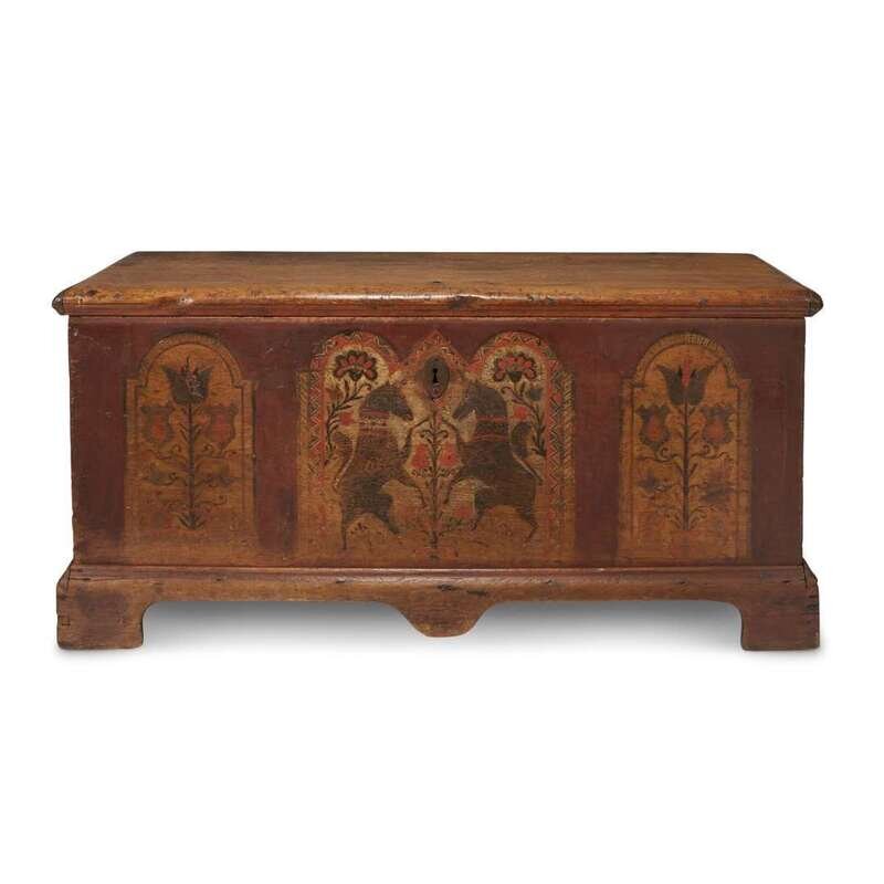 Painted and decorated pine "Black Unicorn" blanket chest Berks County, PA, circa 1785