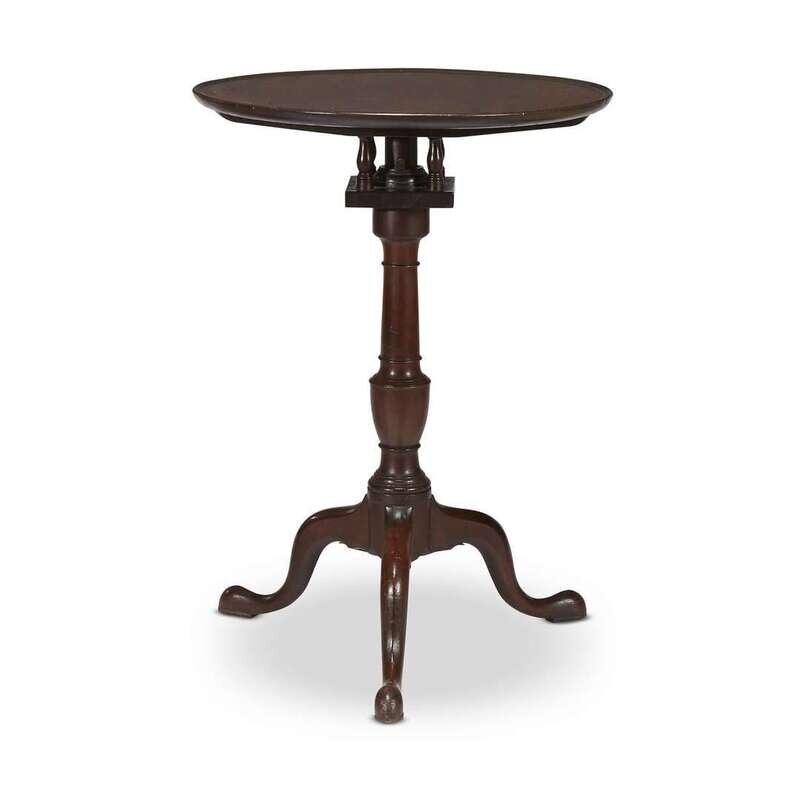 Dish top with birdcage tilts on tapering and urn-form shaft on cabriole legs ending in slipper feet.