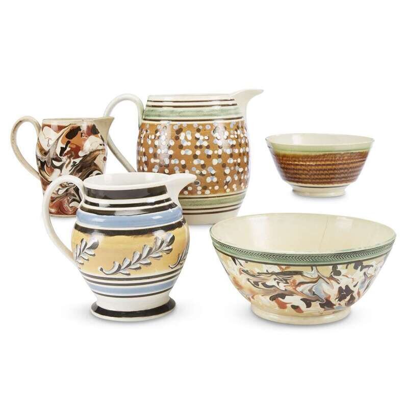 Group of five variously decorated Mochaware pitchers and bowls England, early 19th century