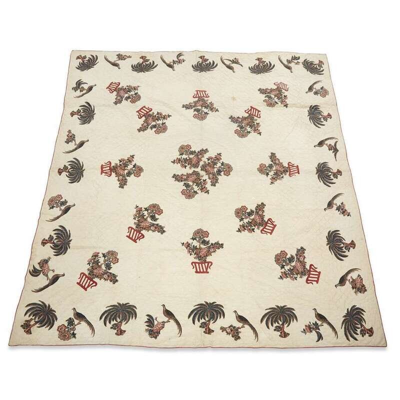 Printed chintz, exotic trees, potted flowers and birds, enclosing arrangement of floral sprays, heightened with clam and wreath quilting.