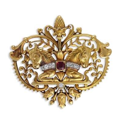 designed as an open work brooch with adorsed mythological figures, highlighted by a ruby and small diamonds.