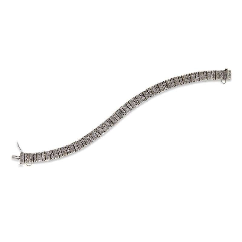 alternating rows of round brilliant and baguette-cut diamonds; estimated total diamond weight: 5.50 carats.
