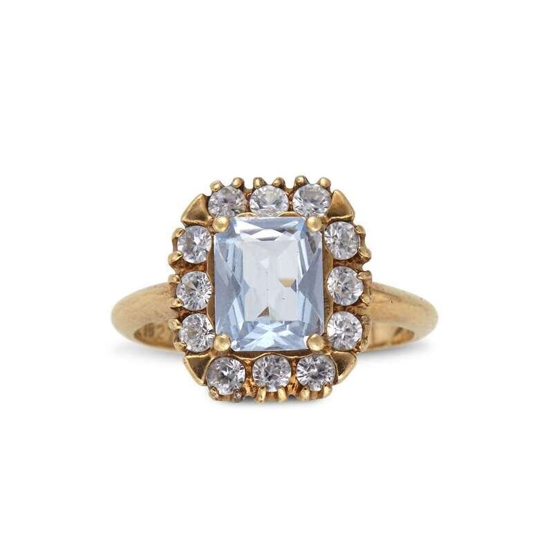 centering a rectangular-cut aquamarine surrounded by colorless simulants.
