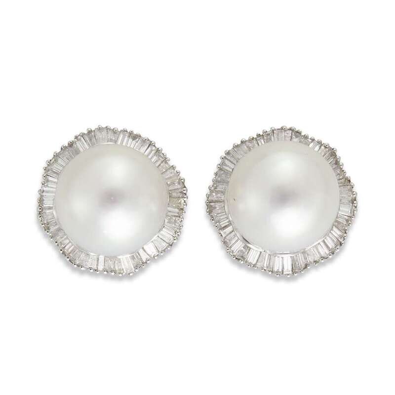 set with a 13.50mm cultured pearl within a surround of tapered baguettes; estimated total diamond weight: 2.00 carats, mounted in eighteen karat gold.