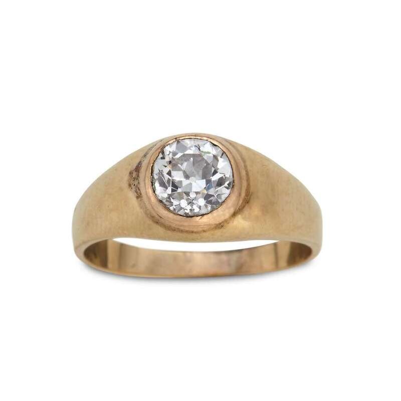 set with an old mine-cut diamond, weighing approximately 0.75 carats, within a fourteen karat gold bezel setting.