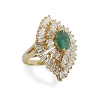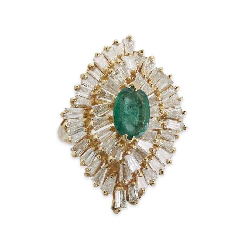 centering an oval emerald, weighing approximately 0.85 carat, surrounded by numerous baguette-cut diamonds; estimated total diamond weight: 3.70 carats.