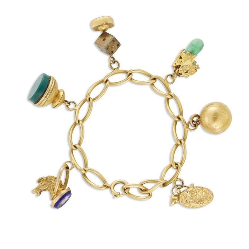 suspending six charms, horse head, hardstones, jadeite, urn and basketball.
