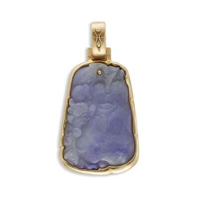 highlighting one carved lavender jade in an eighteen karat gold frame. Nature of jade's color not determined.