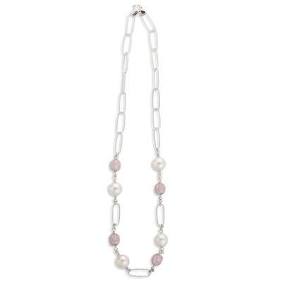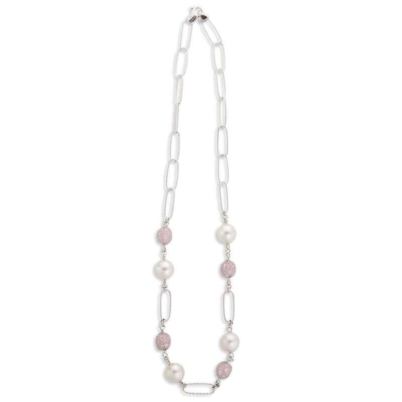 featuring cultured pearls, measuring approximately 10.5 to 11.0mm, synthetic pink stones set in caged beads.