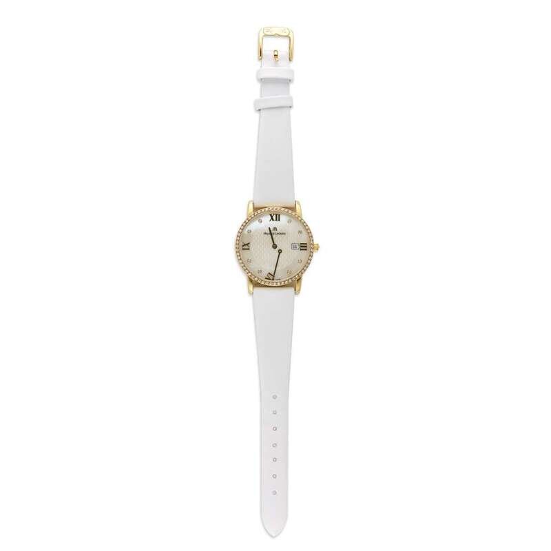 A lady's eighteen karat gold and diamond strap watch, Maurice Lacroix