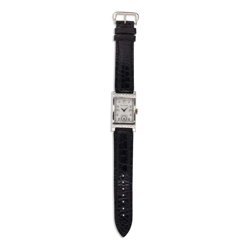 21 jewel movement, calibre 7AK, shoulders and markers at 3, 9 & 12 set with single-cut diamonds. With later strap and gold filled buckle.